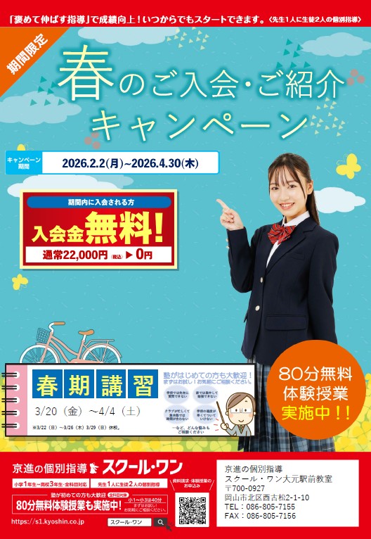 春のご入室キャンペーン4月末まで延長!! トップページ 新着情報 春のご入室キャンペーン4月末まで延長!! 好評につき、春のご入室キャンペーンを4月末まで延長します!! この機会をお見逃しなく!! ← 2026スクールフェスタ会場レポート 漢字検定 6月27日(土) 申し込み締め切り5月20日(水) →